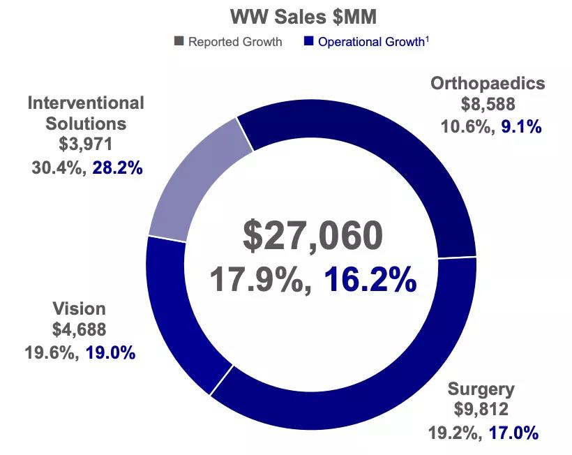 眼科业务占比17%,营收46.88亿美元,同比+19.6%;其中眼科手术暴涨35%,成强生器械增长最强势的子业务。